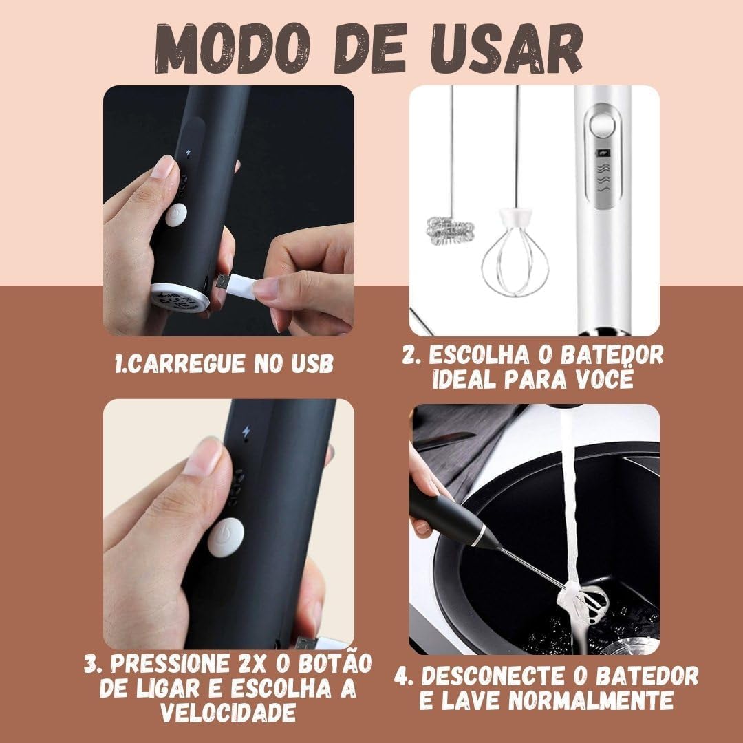 Seu carregamento é via USB, contando com bateria interna de longa duração — diga adeus às pilhas e cabos! O design compacto, leve e sem fio permite que você o leve para qualquer lugar: casa, trabalho, academia ou viagens. Além disso, é super fácil de limpar: basta desconectar o batedor do motor e lavar com água e sabão, garantindo praticidade no seu dia a dia.