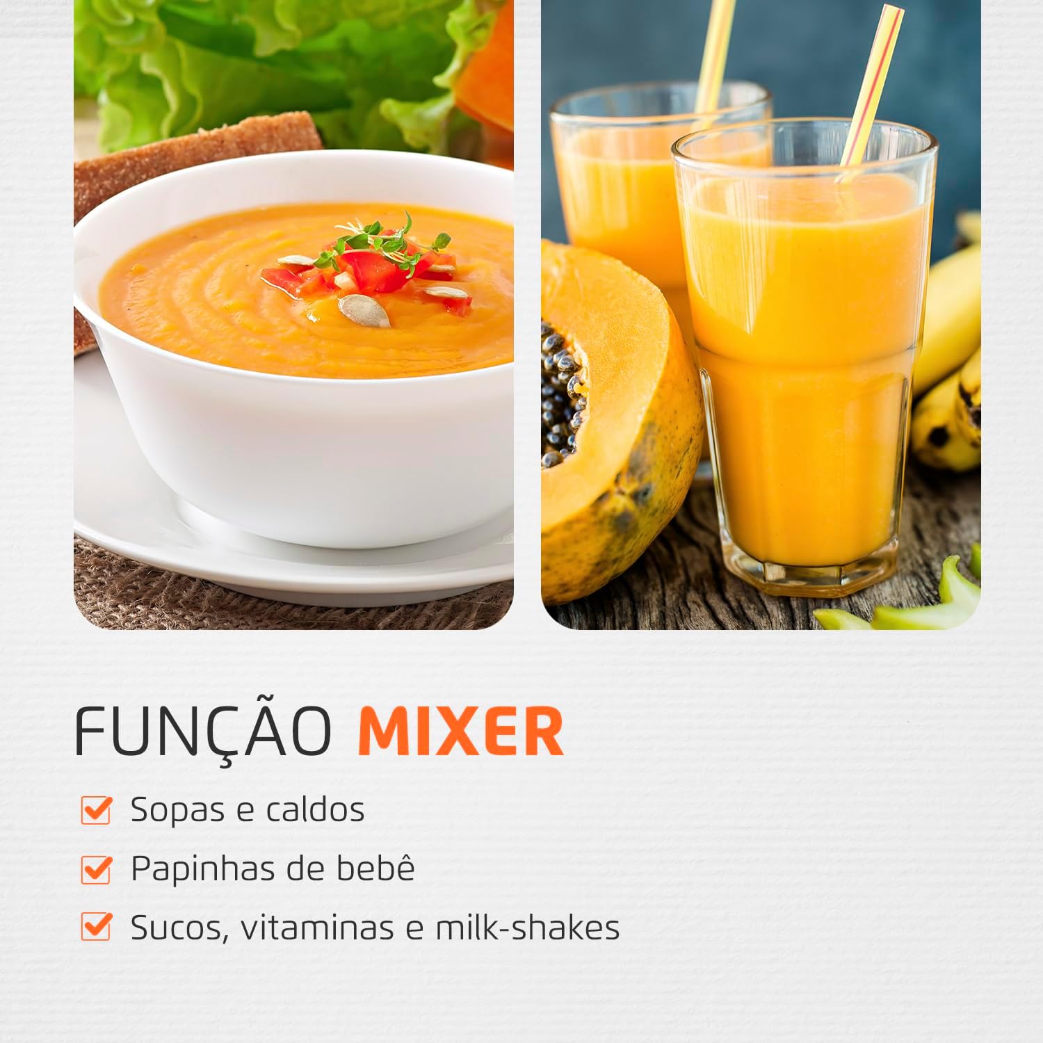 2 EM 1: Eficiente e versátil, o aparelho funciona como mixer e processador de alimentos. Permite preparar sopas e caldos, sucos e vitaminas, triturar legumes e vegetais, grãos e temperos.