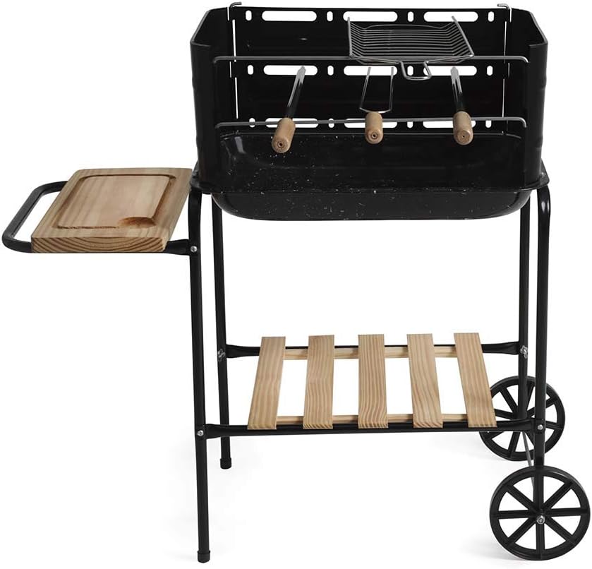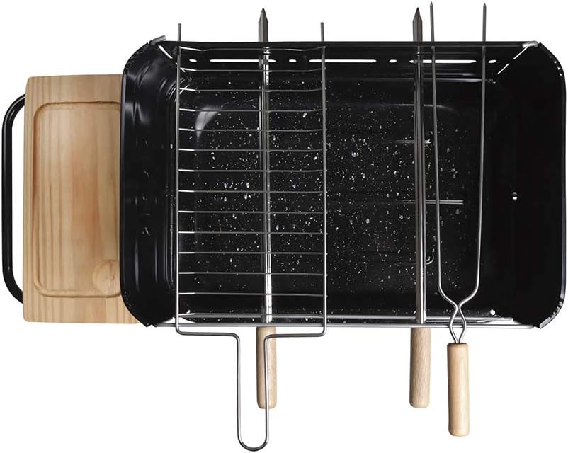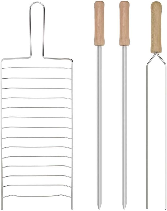 01 Grelha simples – 46,7 cm x 16,7 cm x 1,5 cm; 01 Tábua – 35,3 cm x 18,2 cm x 2,2 cm; 01 Grade de madeira- 35,5 cm x 35 cm x 2,2 cm; 02 Espetos simples – 48cm; 01 Espeto duplo – 48cm; Medidas da bacia: 49,5cm x 34,5cm x 5,5cm;