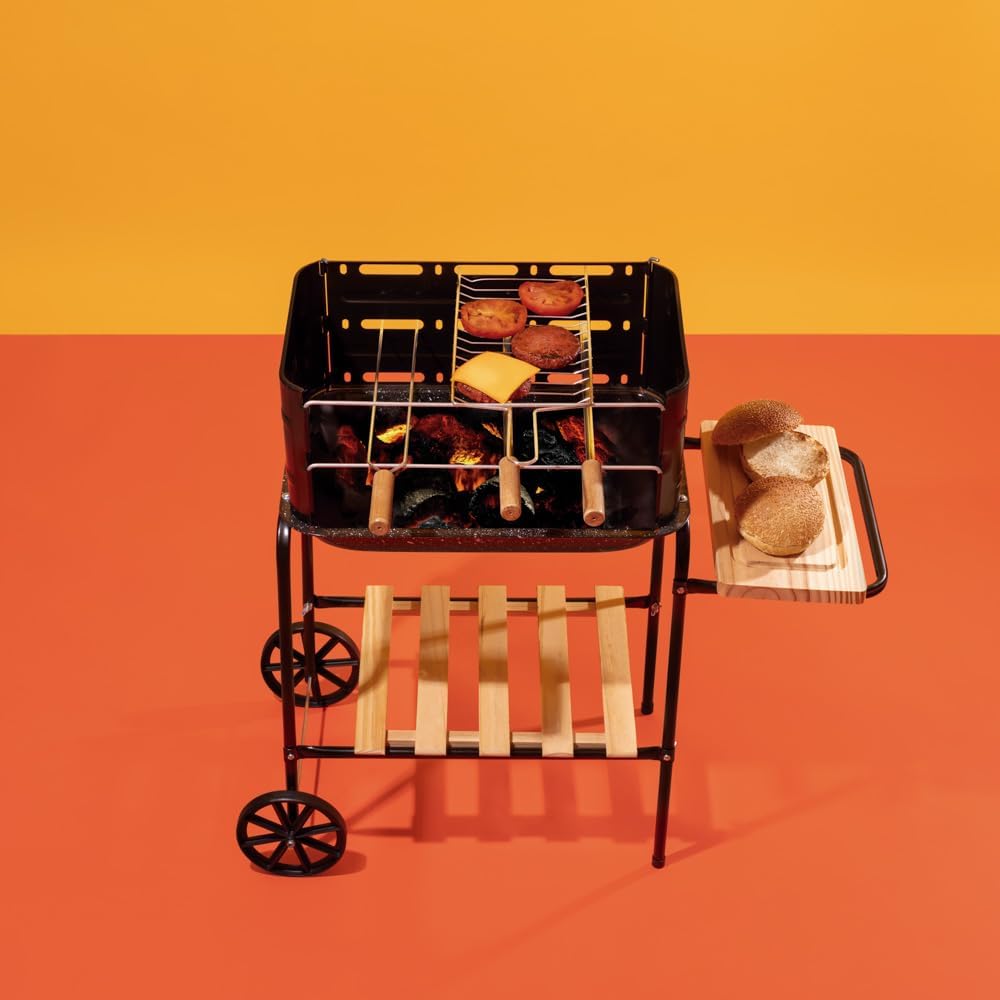 Inclui grelha, tábua, grade de madeira, espetos simples e duplo, e bacia esmaltada com dimensões específicas para churrasco completo