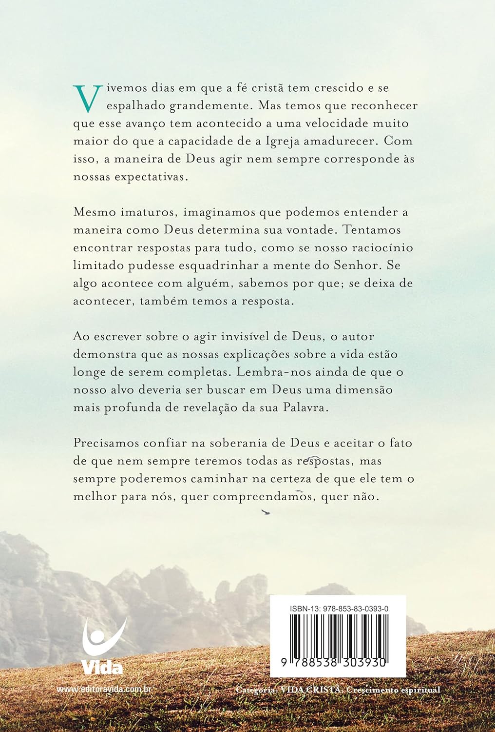 Vivemos dias em que a fé cristã tem crescido e se espalhado grandemente. Mas temos que reconhecer que esse avanço tem acontecido a uma velocidade muito maior do que a capacidade de a igreja amadurecer. Com isso, a maneira de deus agir nem sempre corresponde às nossas expectativas. Mesmo imaturos, imaginamos que podemos entender a maneira como deus determina sua vontade. Tentamos encontrar respostas para tudo, como se nosso raciocínio limitado pudesse esquadrinhar a mente do senhor. Se algo acontece com alguém, sabemos por que; se deixa de acontecer, também temos a resposta. Ao escrever sobre o agir invisível de deus, o autor demonstra que as nossas explicações sobre a vida estão longe de serem completas. Lembra-nos ainda de que o nosso alvo deveria ser buscar em deus uma dimensão mais profunda de revelação da sua palavra. Precisamos confiar na soberania de deus e aceitar o fato de que nem sempre teremos todas as respostas, mas sempre poderemos caminhar na certeza de que ele tem o melhor para nós, quer compreendamos, quer não.