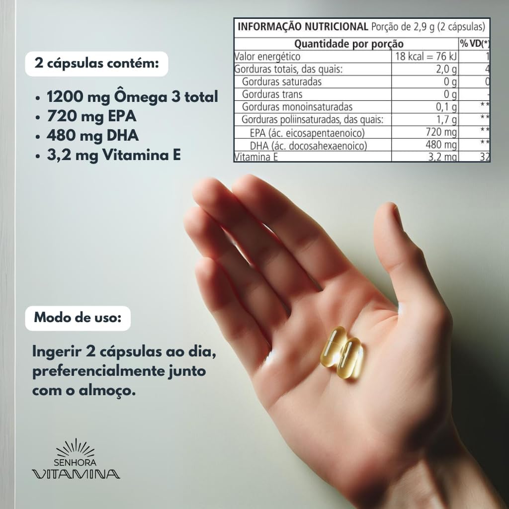 Potência Máxima: Cada dose de apenas 2 cápsulas contém 1.200 mg de Ômega 3 total, incluindo 720mg de EPA e 480mg de DHA com vitamina E, garantindo um ômega 3 fresquinho e altamente eficaz.