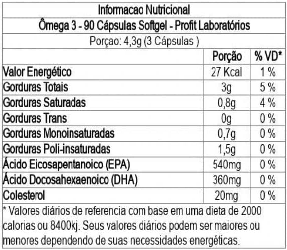 Os ácidos graxos ômega 3 epa e dha, auxiliam na redução dos triglícerídios. Os ômega 3 da profit, são livres de metais pesados, selecionados e concentrados, para se obter a potência máxima de ômega 3 epa e dha. Sugestão de uso: ingerir 3 cápsulas ao. Ingredientes: óleo de peixe. Composição da cápsula: gelatina, água purificada e umectante glicerina. Não contém glúten. Alérgicos: contém derivados de peixe.