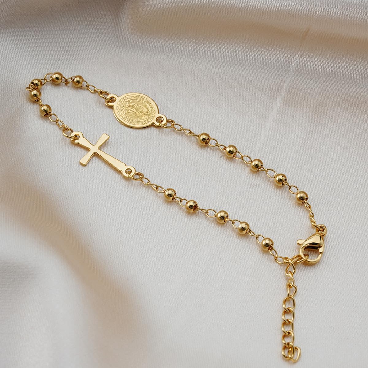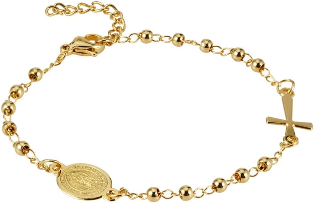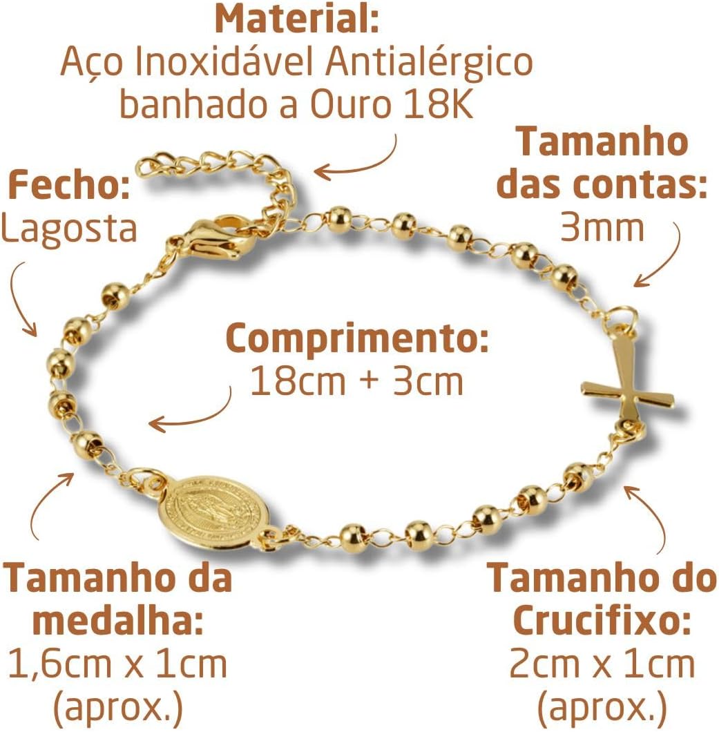 Material: Aço Inoxidável Antialérgico;Banho: Ouro 18K;Hipoalergênico: SimFecho tipo: Lagosta;Comprimento: 18cm (ajustável + 3cm);Tamanho da medalha de Guadalupe: 1,6cm x 1cm (aprox..);Tamanho do Crucifixo: 2cm x 1cm (aprox..);Tamanho das contas: 3mm;Gênero: Feminino.