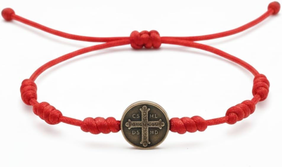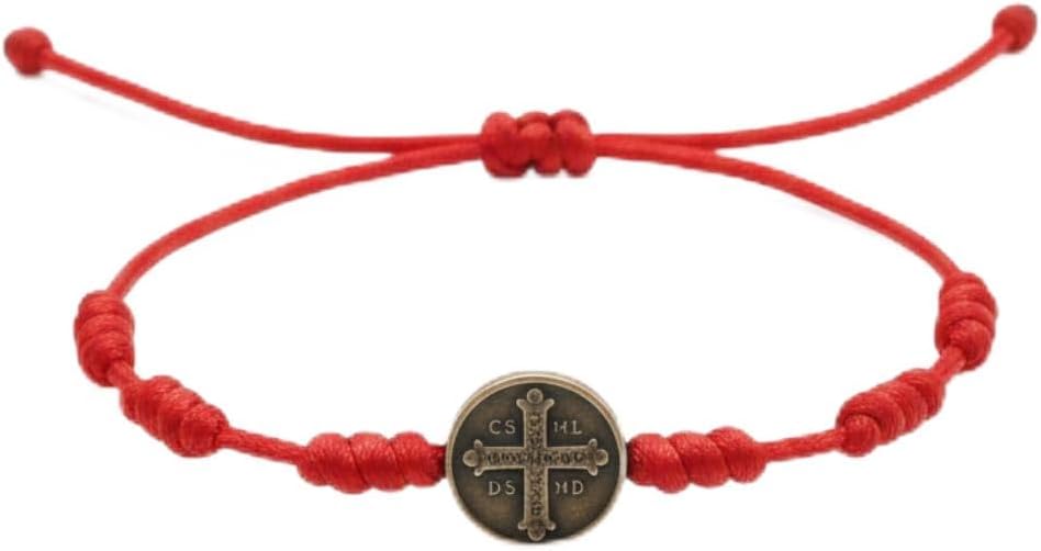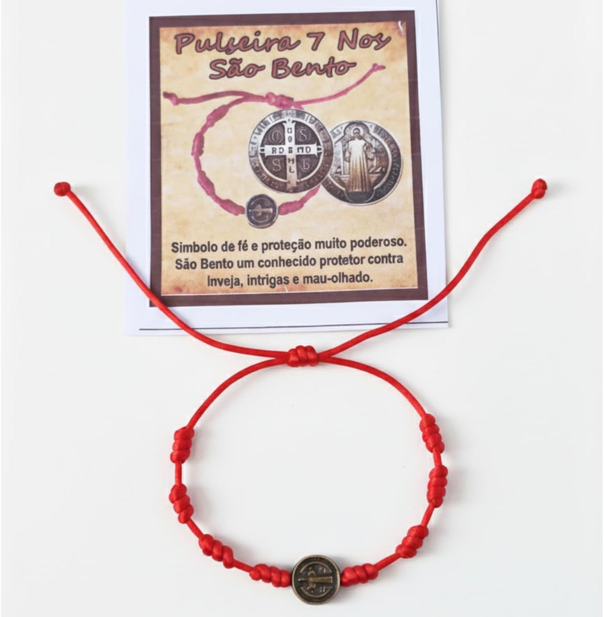 Pulseira Kabbalah 7 Nós São Bento, Cordão Vermelho com Medalha Religiosa, Proteção Espiritual, Ajustável