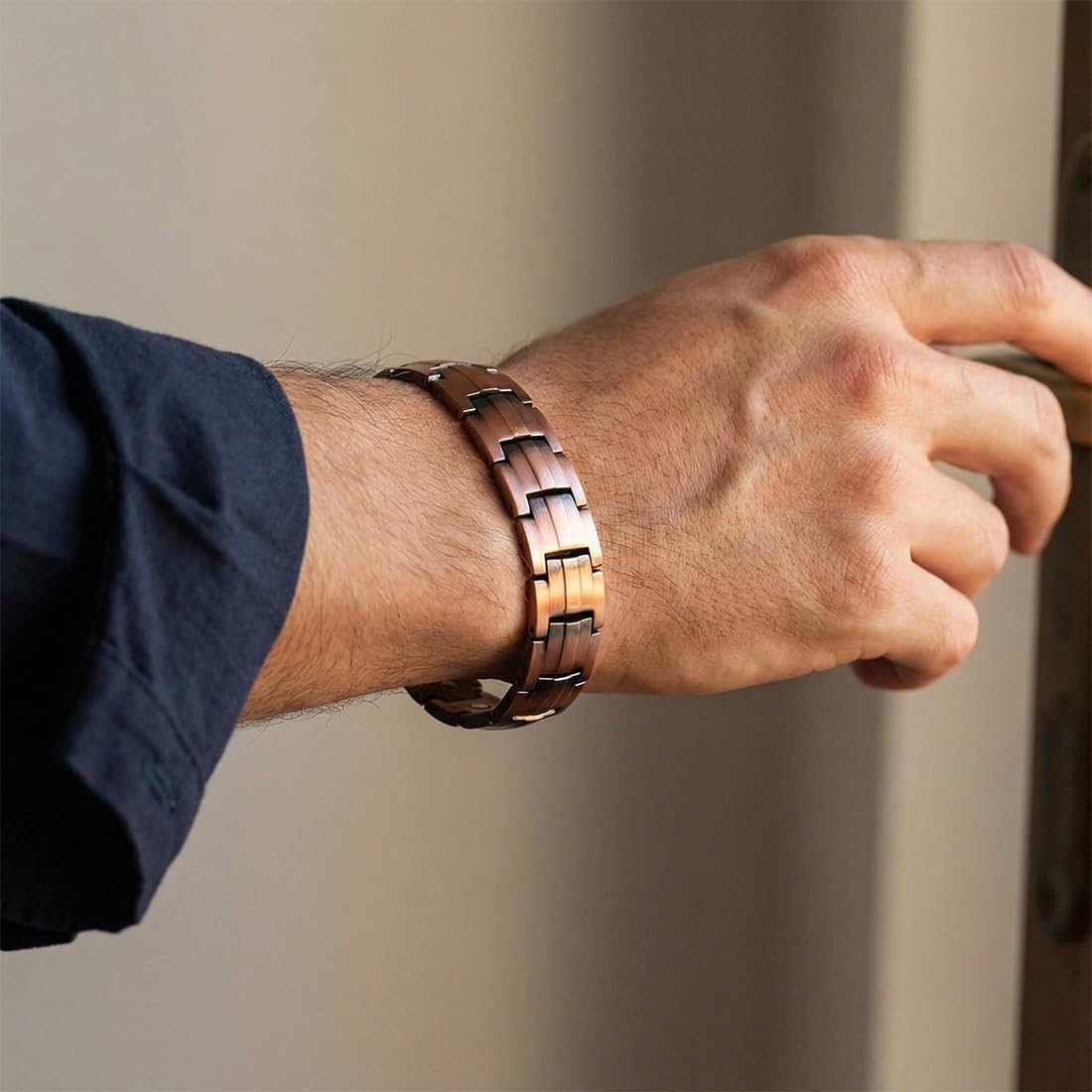 Pulseira de cobre sólido: Feita de cobre puro com um acabamento duradouro para evitar manchas e minimizar arranhões. Pulseira masculina com elementos integrados: projetada com vários componentes discretos para um ajuste confortável.