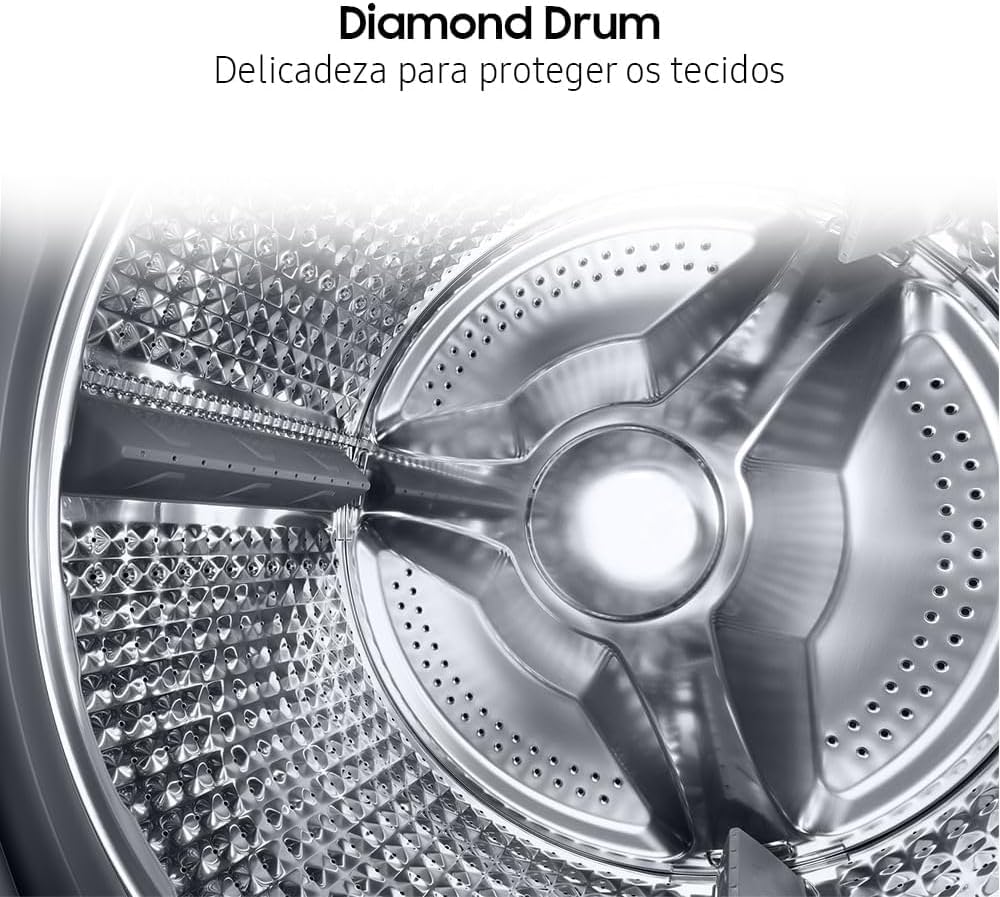 O design do tambor da lava e seca Samsung é delicado com as suas roupas. Seus pequenos orifícios em formato de diamante também ajudam a proteger os tecidos, reduzindo o atrito e prevenindo que suas roupas desfiem durante a lavagem.