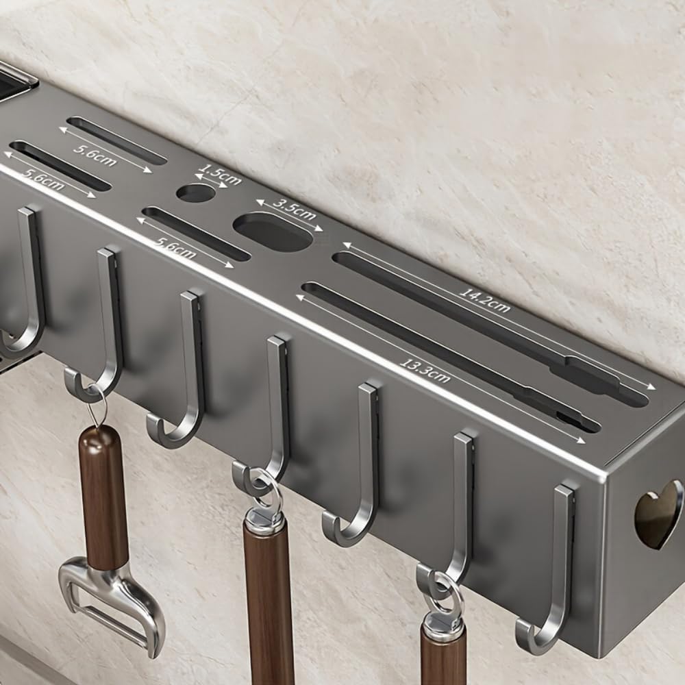 Confira o suporte porta-utensílios de cozinha com 10 ganchos móveis, projetados para organizar sua cozinha com um suporte de parede funcional e resistente de 60 cm.