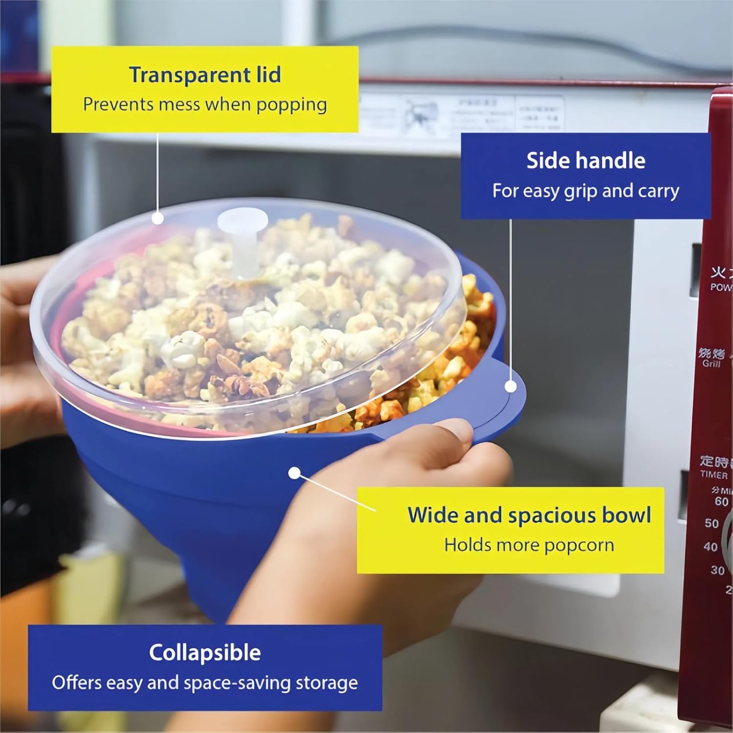 Tigela dobrável de silicone para fazer pipocas com tampa – Seguro para forno e micro-ondas para petiscos saudáveis, fácil de limpar – azul
