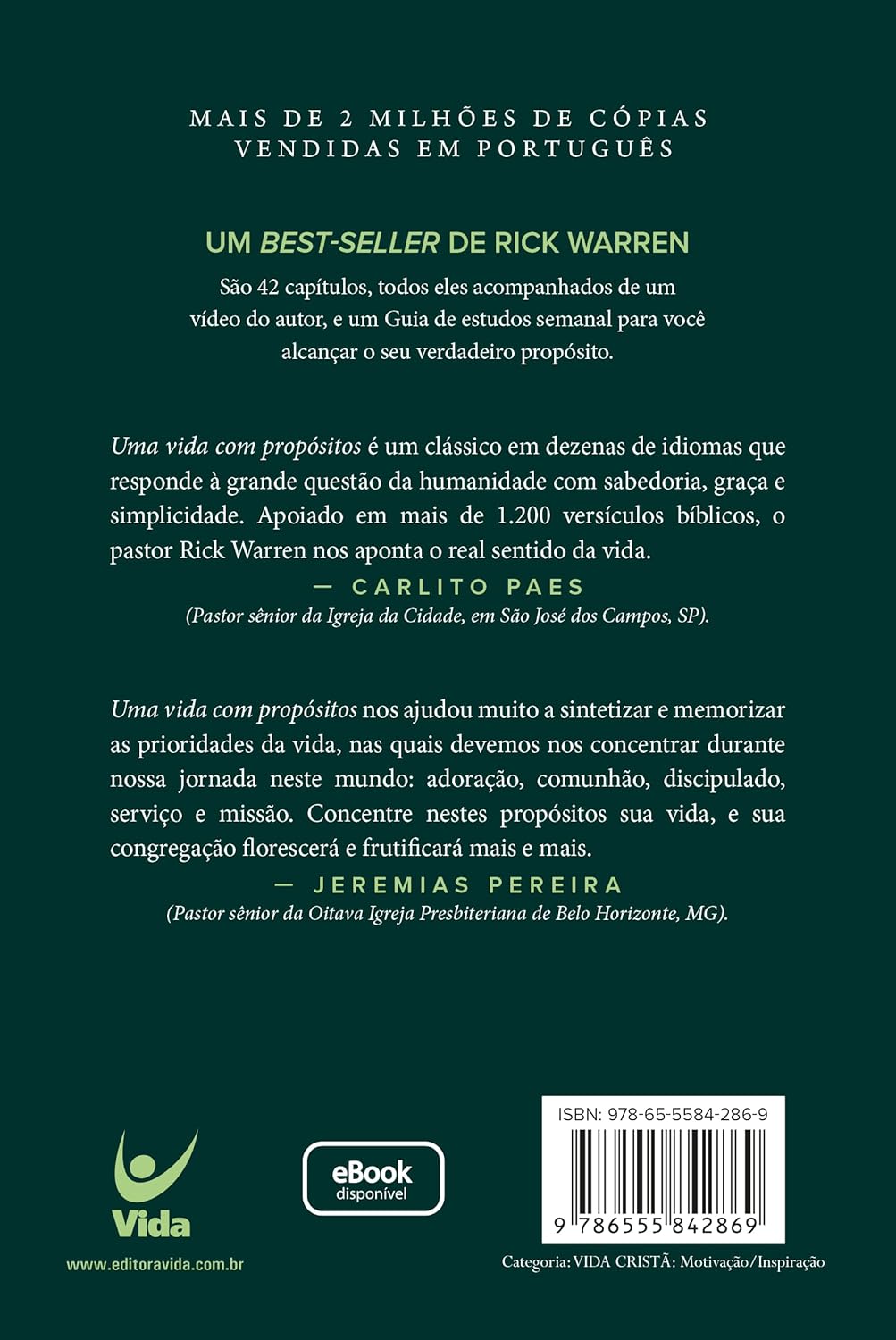 São 42 capítulos, todos eles acompanhados de um vídeo do autor, e um Guia de estudos semanal para você alcançar o seu verdadeiro propósito.Uma vida com propósitos é um clássico em dezenas de idiomas que responde à grande questão da humanidade com sabedoria, graça e simplicidade. Apoiado em mais de 1.200 versículos bíblicos,