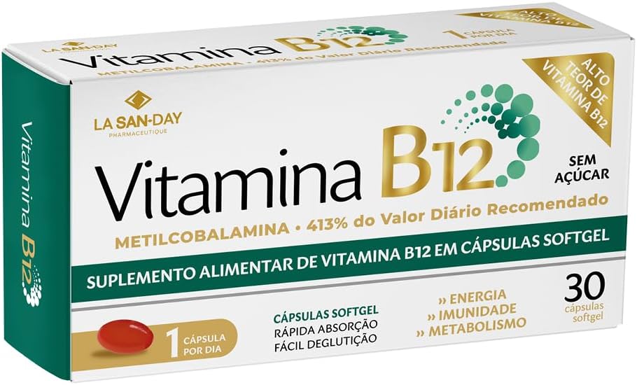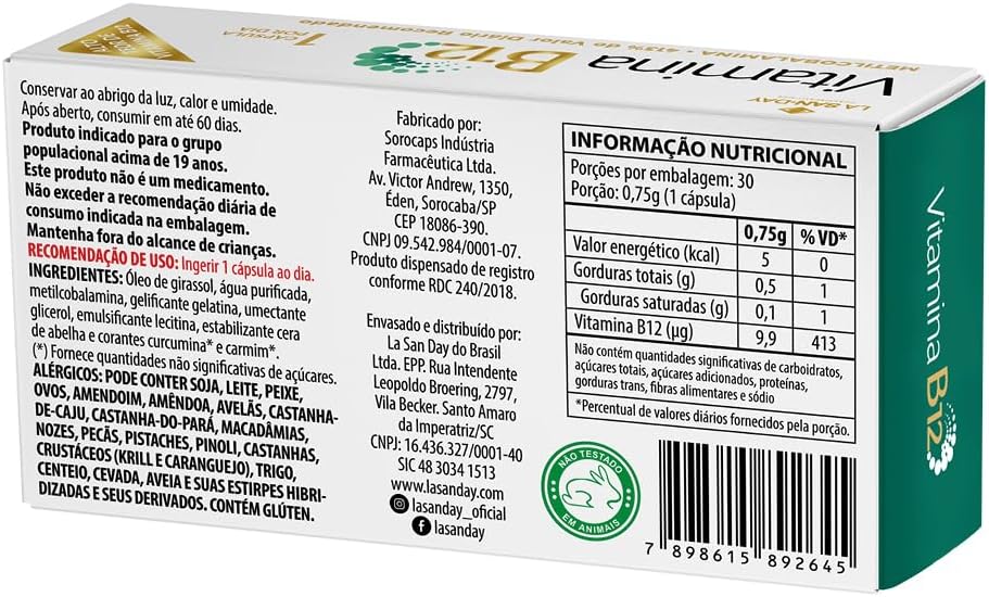 RECOMENDAÇÃO DE USO: Suplemento alimentar de uso adulto (a partir de 19 anos de idade): ingerir 0,75g (1 cápsula) ao dia ou seguir a recomendação de um profissional da saúde. COMPOSIÇÃO: Óleo de girassol, água purificada, metilcobalamina, geleificante gelatina, umectante glicerina, emulsificante lecitina de girassol, estabilizante cera de abelha e corantes cúrcuma e carmim. APRESENTAÇÃO: Caixa com 30 cápsulas softgel. ALÉRGICOS: Pode conter soja, leite, peixe, ovos, amendoim, amêndoa, avelãs, castanha-de-caju, castanha-do-pará, macadâmias, nozes, pecãs, pistaches, pinoli, castanhas, crustáceos (krill e caranguejo), trigo, centeio, cevada, aveia e suas estirpes hibridizadas e seus derivados. Contém glúten.