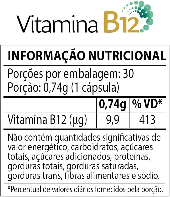 Vitamina B12 (30 Cápsulas) – vitamina que pertence ao complexo B, participa do metabolismo de uma série de carboidratos e ácidos graxos